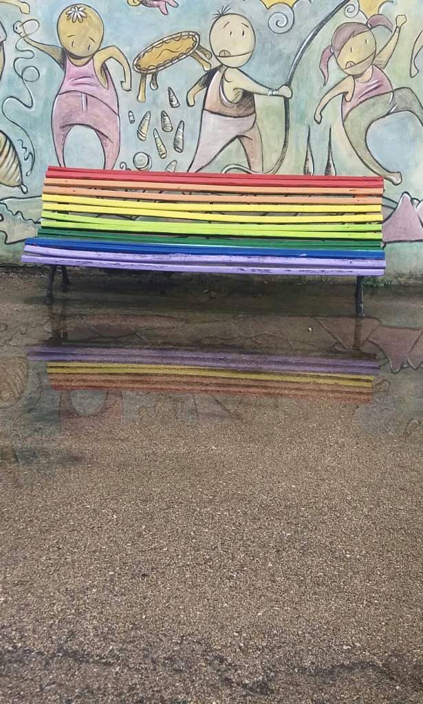 Los alumnos de quinto hemos realizado un taller de plástica y convivencia para pintar el banco de la paz, que ahora luce los colores del arcoíris.